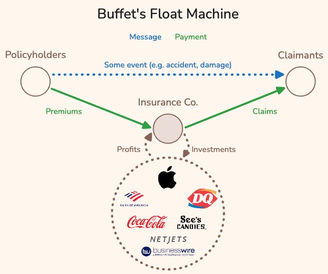 Insurance companies are natural float factories: they collect premiums upfront and pay claims later, sometimes years later if at all. These companies succeed in making sure that premium inflows are greater than claim outflows through underwriting the risk of events (accidents, damages, etc.). Insurers can also generate profits by investing the float they naturally generate.