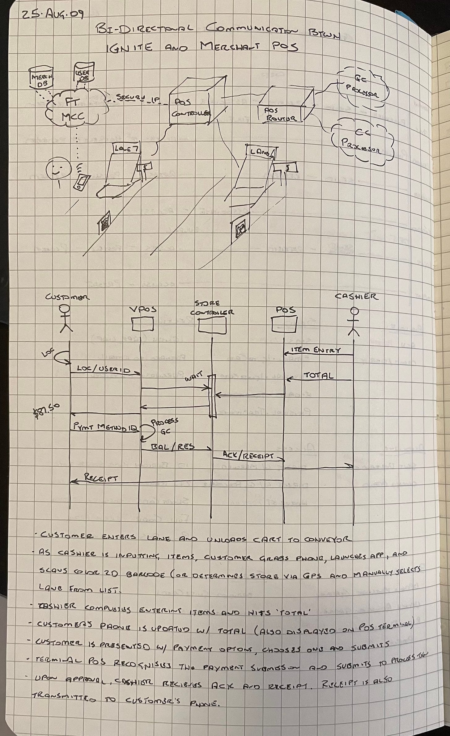 The bookmarked in Dessert’s notebook is the first sketch of a foundational patent still used by Apple and Samsung Pay to this day. Firethorn had already worked through storing credit card information on their database and using that information to make credit card payments. The risk and compliance challenges, however, made this system untenable for the company.